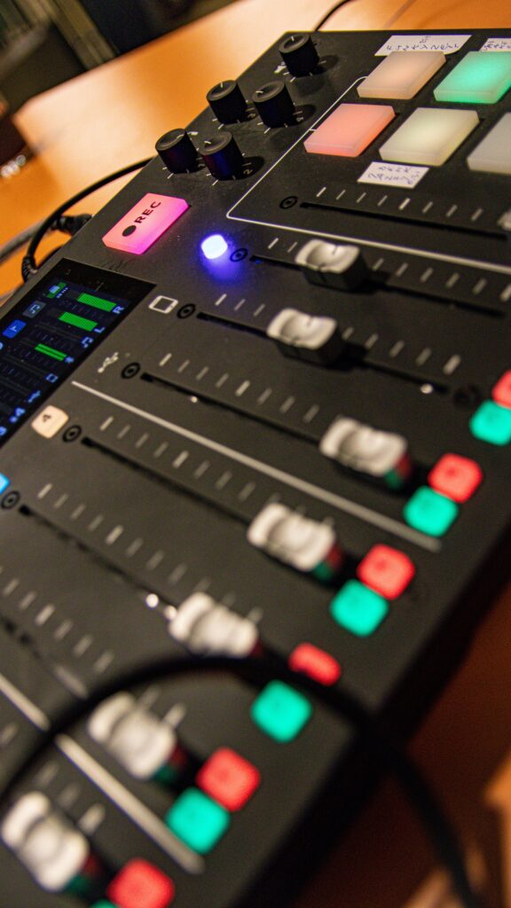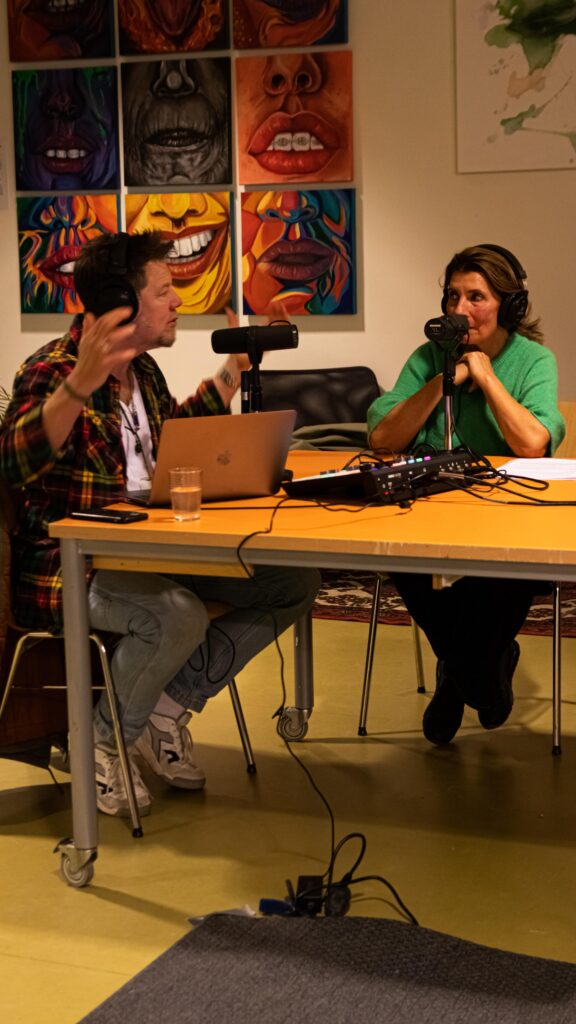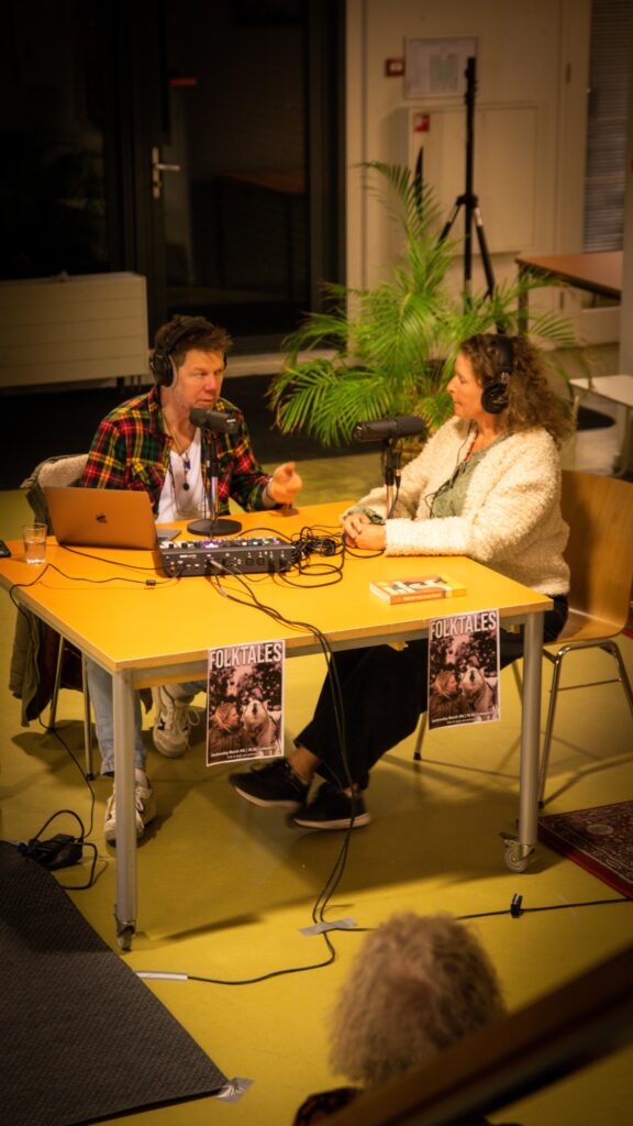 Rond 19:15 uur startte de live opname van Radio Olympus. Met de koptelefoons op en de microfoons in de aanslag, doken de hosts diep in de wereld van kunst, cultuur en maatschappelijke verhalen. De sfeer was intiem, alsof je als publiek echt even onderdeel was van het gesprek. De posters van ‘Folktales’ aan de tafel herinnerden ons eraan hoe belangrijk het vertellen van verhalen is in onze gemeenschap.